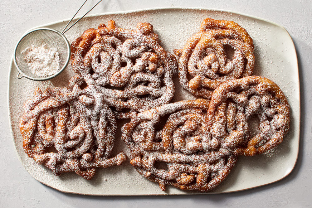 For more traditional, carnival-style funnel cakes, substitute water for the apple cider and omit the cinnamon from the confectioner’s sugar.