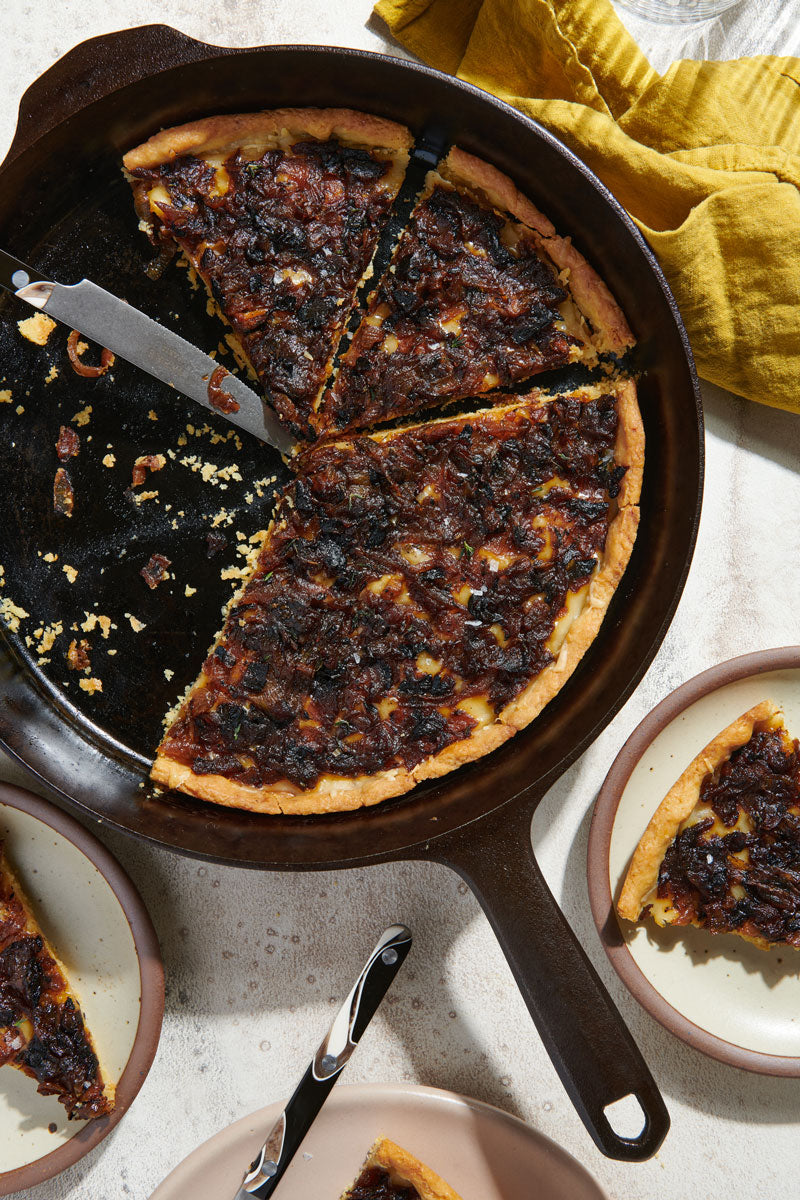 Here, we top a skillet-baked shell with Gruyère cheese and the aforementioned onions to make a tart that has all the deep flavors of a classic French onion soup.