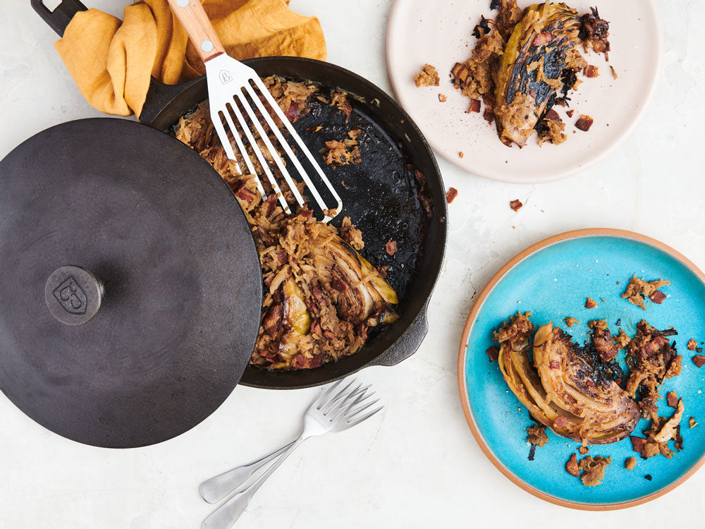 Our one-skillet recipe begins, as many delicious things do, with bacon, which provides the fat for searing the cabbage wedges, and adds a smoky flavor to the braising liquid thickened and sweetened with grated apple. The braise’s fall flavors make for a meat-lover’s side dish: serve it with pork chops or roast chicken, or smother it over baked salmon.