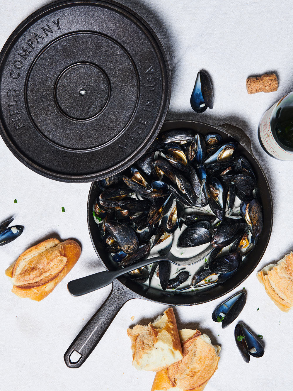 In a No.8 (10 ¼”) cast iron skillet, melt the butter over medium-low heat. Add the shallot, season with salt, and cook, stirring occasionally, until softened, 5 to 7 minutes. Add the cider and whisk in the mustard. Bring the liquid to a simmer, add the mussels and cover the pan. Cook until all of the mussels have opened, about 5 minutes (discard any mussels that don’t open).