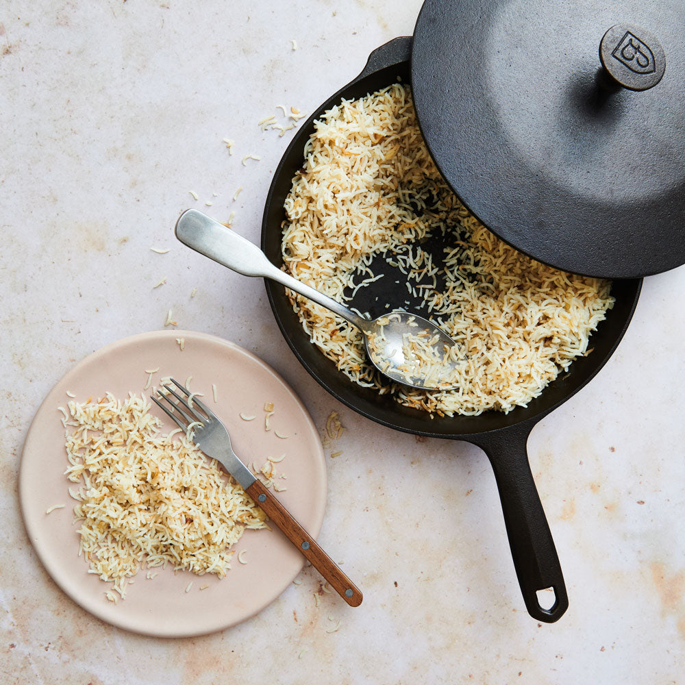 But there’s a technique that yields both extremely consistent results and more flavorful rice: pilaf. Following a method that mimics risotto, you start by sweating a base of aromatics (usually onion), then adding rice and toasting it until it’s translucent. This important step both helps lock in the rice’s starch and add a slightly nutty flavor. Then it’s up to chicken stock (or your cooking liquid of choice) to do work.