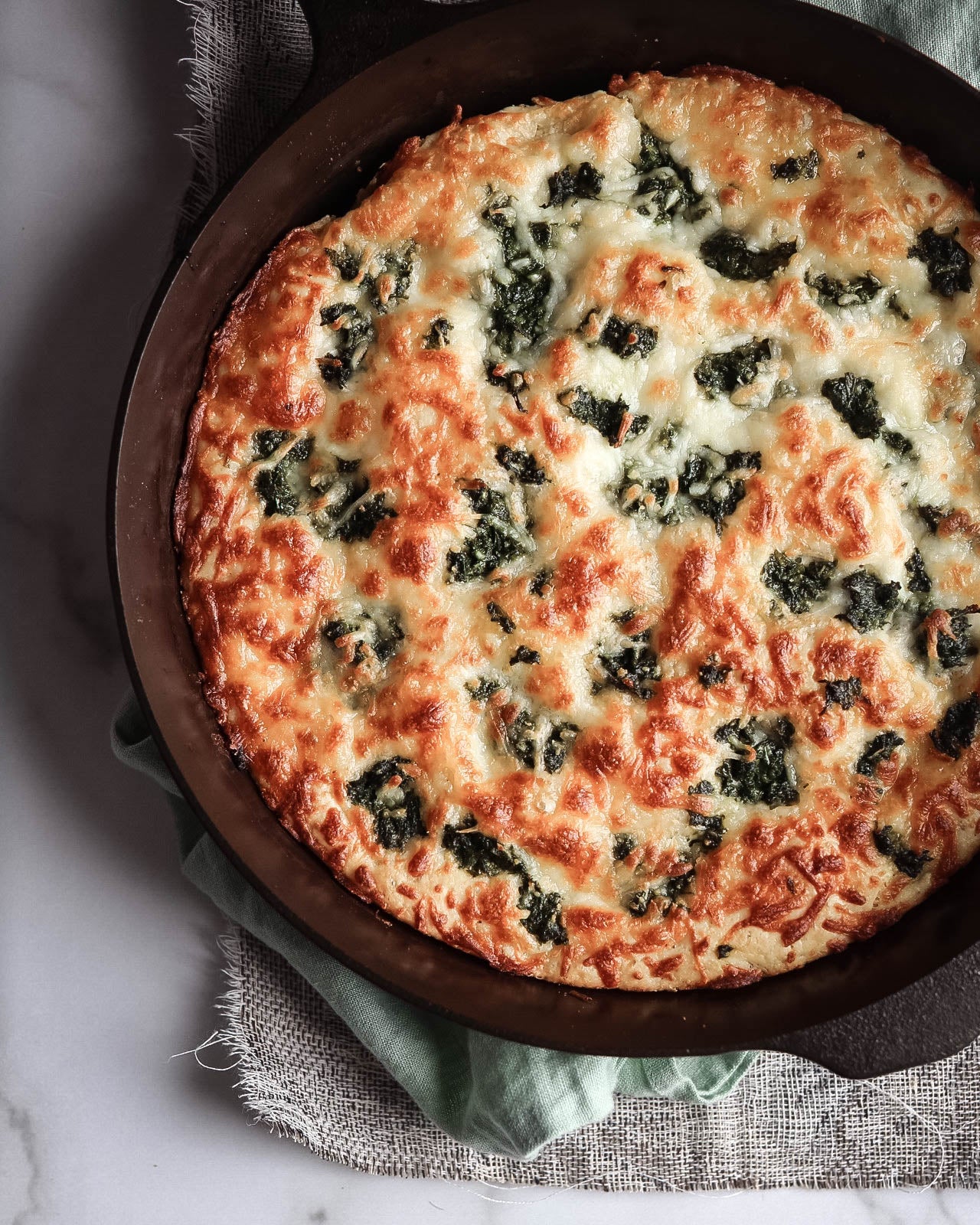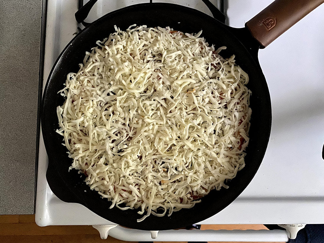Spread the sauce in a thin layer over the surface of the dough using a spatula or the back of a spoon, leaving about ¼ inch along the sides. Add your toppings and then top the entire surface area with cheese. Be generous with your cheese along the edge of the skillet as this will help you achieve a crispy, glistening browned crust.