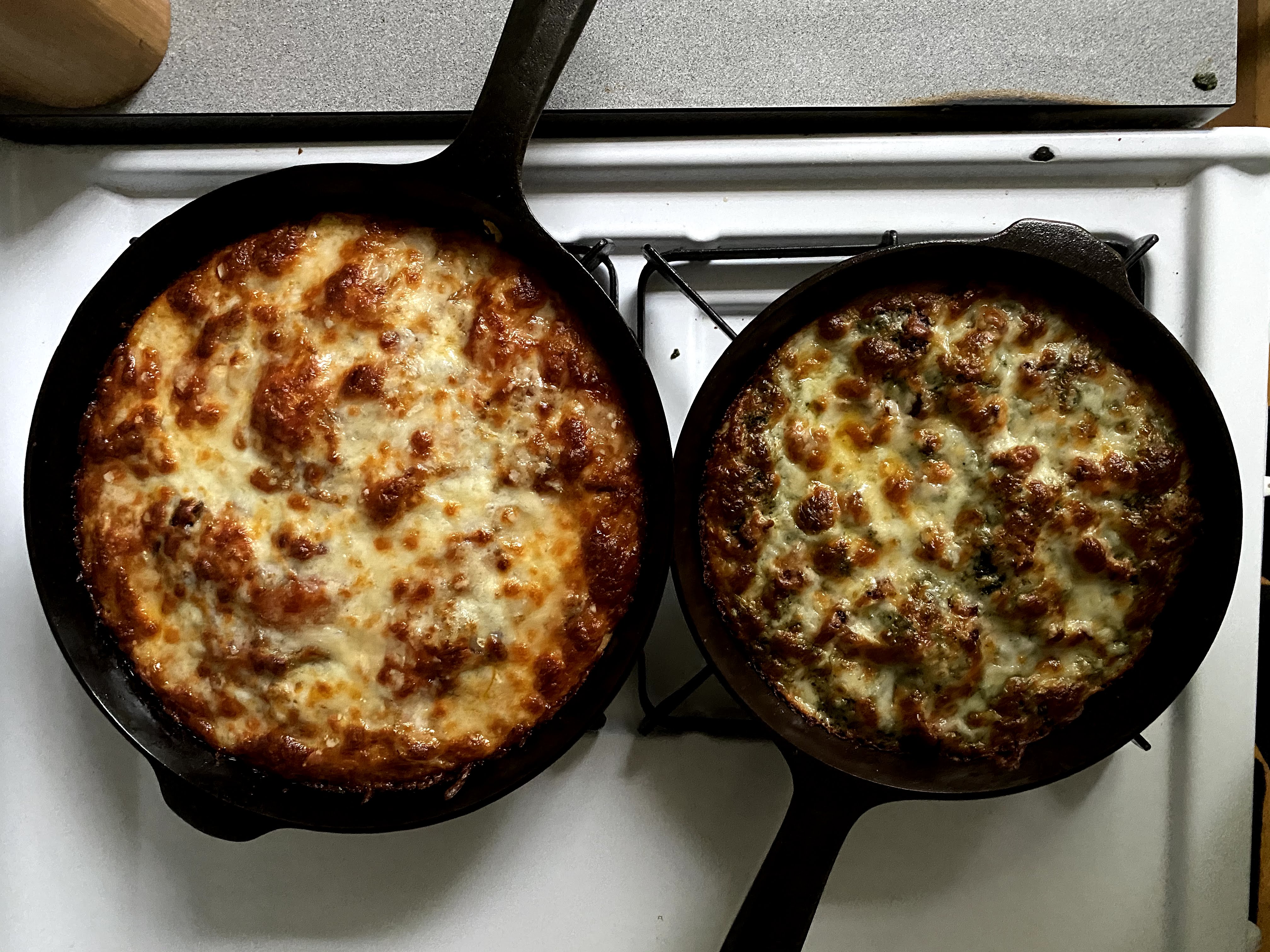 You can use a Field skillet to make cast iron pizza in just about any style, using store-bought or homemade dough and sauce, and whatever toppings you have on hand. For the best melty cheese, you’ll want low-moisture mozzarella. Feel free to add a little cheddar, caciocavallo, Brick cheese, or ricotta for white pies.