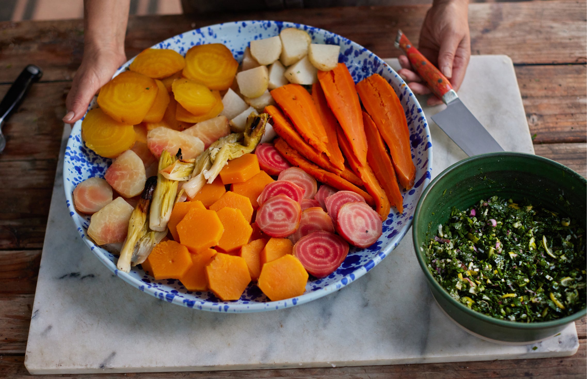 When you flip the chicken, add all the fresh herbs, the chopped root vegetables, and the bay leaves to the frying oil. Allow them to cook alongside the chicken for the last 10-15 minutes.
