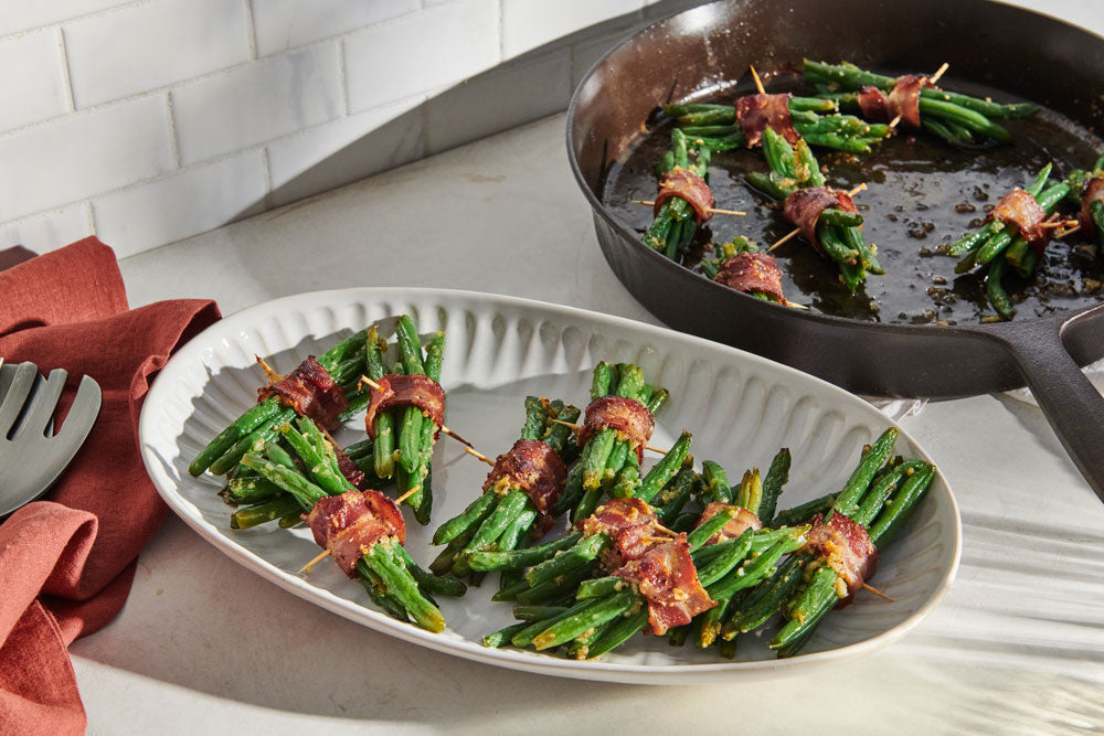 Green bean bundles are a staple on southern Thanksgiving tables. Packs of green beans are wrapped up in bacon and covered with a sweet glaze, then roasted until everything is crispy and the flavors have melded together. This take on green bean bundles uses a peppery, garlicky, honey-butter glaze in place of the more traditional brown sugar. An added bonus: These look great served up straight from your Field Skillet.