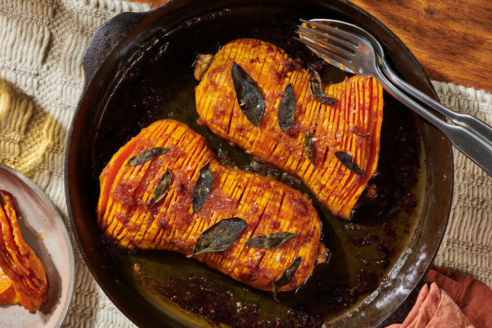 Though normally applied to potatoes, the Hasselback method—that is, thinly slicing an ingredient crosswise almost all the way through, then roasting it until it resembles a gratin flipped on its side—has been applied to various fruits and proteins (even s'mores!) over the years. Here, we apply it to large butternut squash, brushed with a lightning-quick glaze made from apple butter, to make a centerpiece-worthy side that’s also great for seasoning your Field Skillet.
