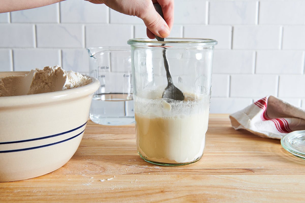 How you maintain your starter from here on depends on how frequently you use it. If you’re a power baker and plan to use it several times a week, leave it on the counter and feed it daily, discarding about half of the starter before you add equal weights of water and flour. If you’re planning to use your starter about once a week, leave it in the refrigerator and feed it the day before you’ll be using it. Wherever you store your starter, you should keep it covered, but allow for a little airflow. With a flip-top glass jar, close the jar but leave it unlatched. With a plastic deli container, poke a couple of holes in the top or leave it slightly ajar.