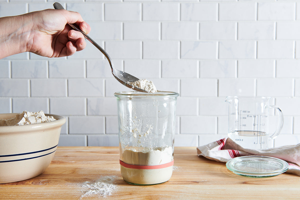Once you’re mentally ready, grab a 1-quart glass jar or plastic storage container and wash it well (even better: sanitize it in the dishwasher or with boiling water). Flip-top jars and plastic deli containers are great, because you can leave the top cracked open to allow for some airflow (which your starter will need).