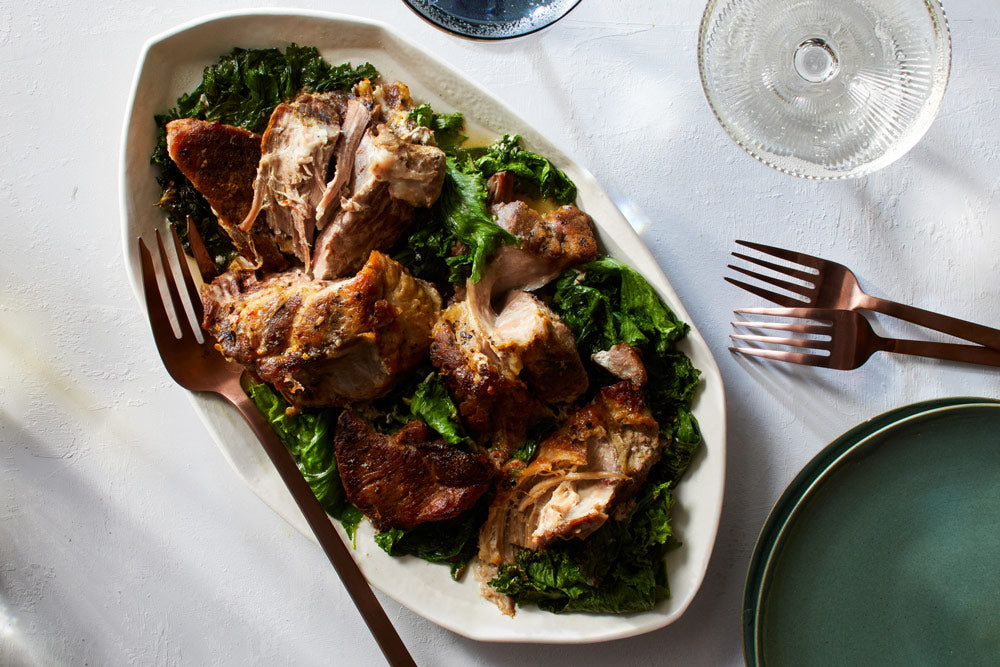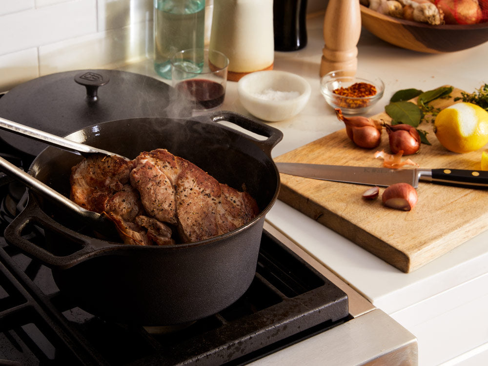 Pork braised in milk is a classic Italian dish (maiale al latte) and a decadent, low-prep meal that’s ideal for making on a lazy weekend afternoon. Our recipe is perfectly sized for our No.8 Dutch Oven, and becomes a one-pot meal by wilting mustard greens in the creamy braising liquid.