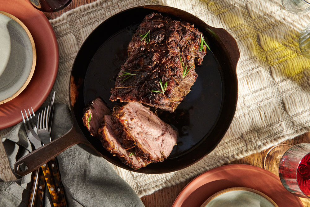 Preheat the oven to 450°F and place a rack in the center. If using a boneless pork shoulder, use butcher’s twine to tie it into a log (here’s a tutorial). Place the pork, fatty side up, in a No.10 Field Skillet. If using a bone-in pork shoulder, place the pork in the skillet, skin side up.