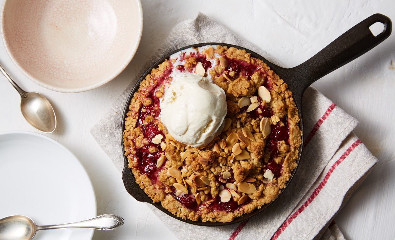 Crumble remaining topping over the berry filling and sprinkle with remaining almonds. Bake until topping is crisp and golden and filling is bubbling, 25-30 minutes. Let cool slightly. Scoop vanilla ice cream over warm tart and serve immediately.