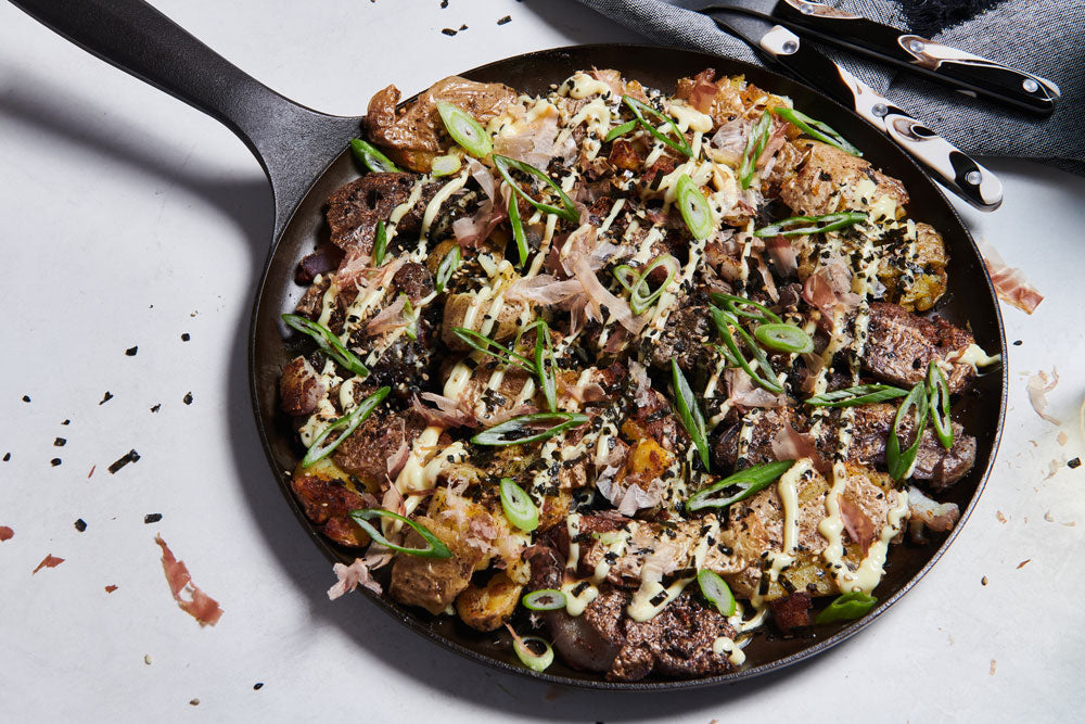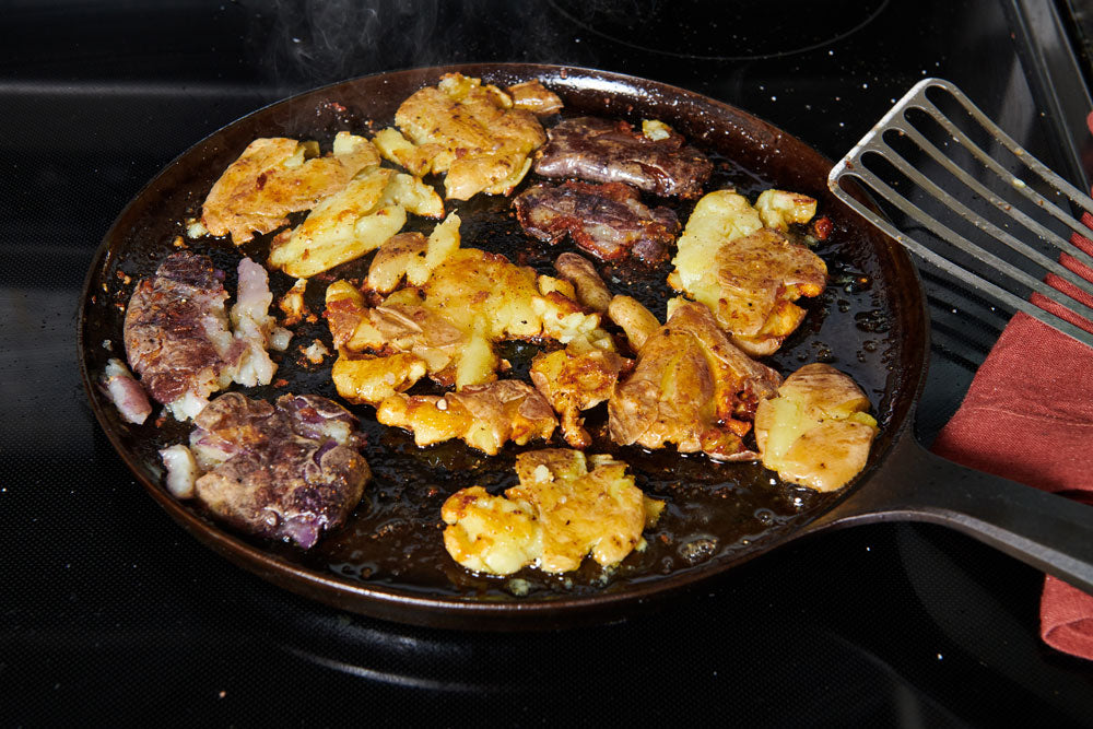 The technique for preparing these tasty tubers is borrowed from tostones, a Latin American dish in which slices of unripe plantains are fried, smashed, then fried again to yield crispy pucks of deliciousness. Instead of double frying, however, we simmer the potatoes until tender, give them a gentle smash, then sear them in a hot No.9 Field Griddle (or skillet).
