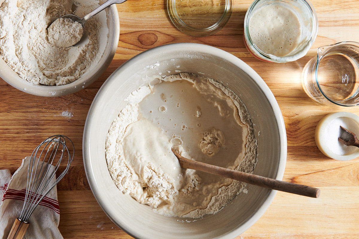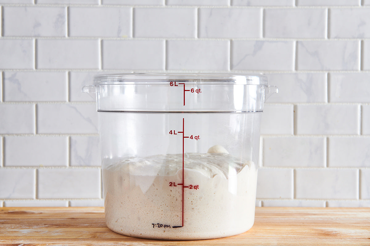 Mixing and Bulk Fermentation: We recommend making the dough at night or first thing in the morning, as it will need about 12 hours to complete its fermentation. In a large mixing bowl or plastic container (we use a 6-quart Cambro), whisk together the flour and salt. Add the water and starter and stir with a wooden spoon or nonstick spatula until you can’t see any dry flour; the dough will be sticky and somewhat lumpy. Cover the bowl with plastic (or the container with its lid) and let rest at room temperature for 15 minutes.