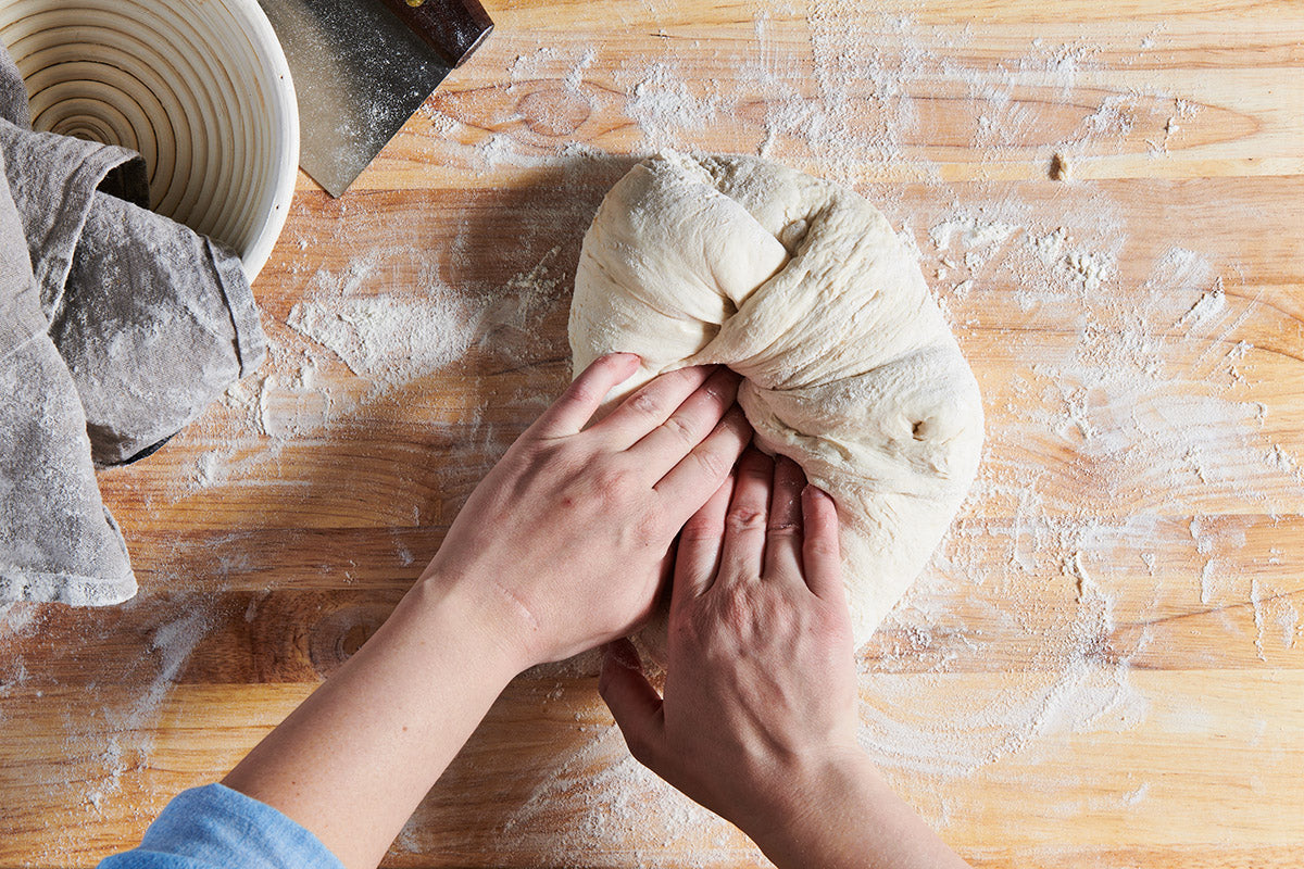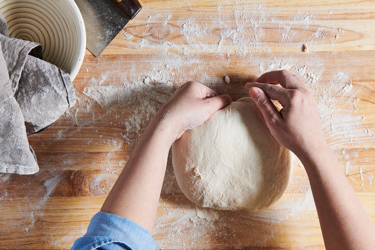 Flour your hands, then fold the sides of the dough under to form it into a ball (the top of the ball will be stretched and tight, with the seam underneath).