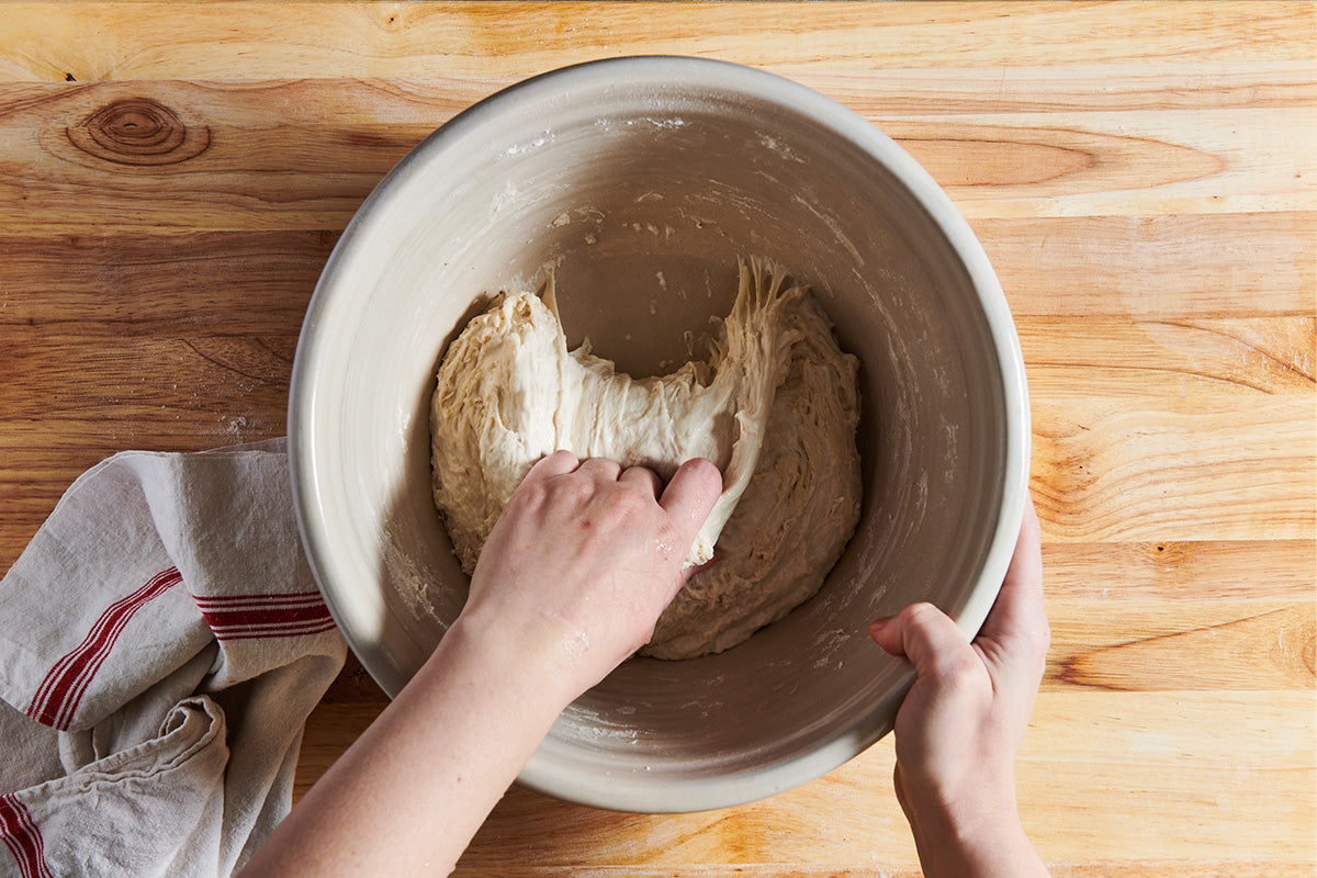 Wet one of your hands and grab one side of the dough, holding the bowl steady in your other hand. Lift and fold it over the middle, then press it down firmly. Rotate the bowl a quarter turn and repeat, making a total of four folds. Cover the bowl and let rest for 15 minutes. Repeat this step two more times, letting the dough rest 15 minutes between each fold. When you’re finished, the dough should be relatively smooth and springy.