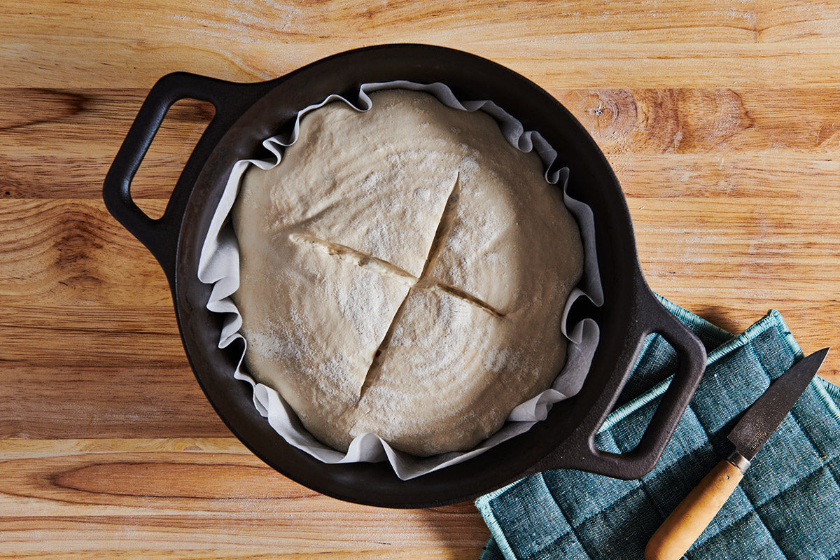 When you’re ready to bake, preheat the oven to 450°F and position a rack in the lower third of the oven (usually the second rung from the bottom), and place a covered No.8 Dutch Oven on the rack. If you have a baking stone or steel, place it on the lowest oven rack. Let the oven preheat for at least 45 minutes (this is a great time to apply a layer of seasoning oil to your Dutch oven, following the Field Method).