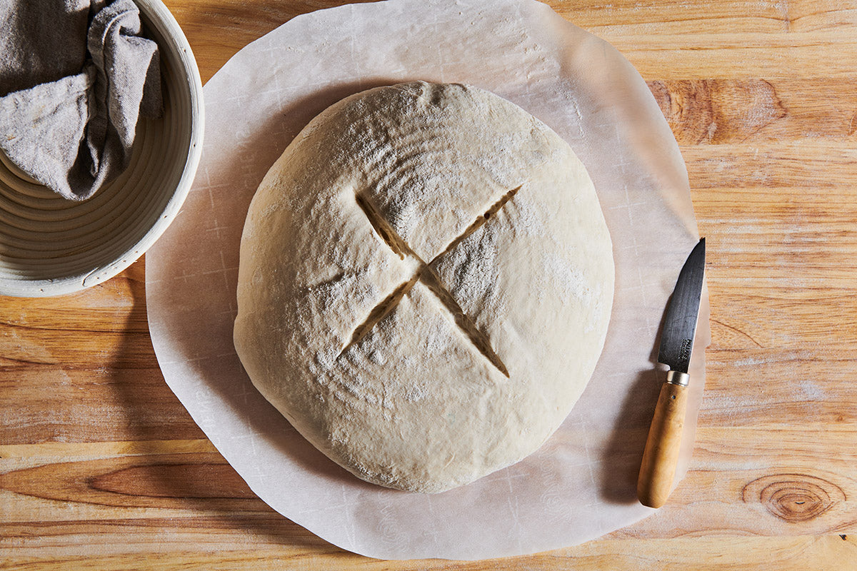 Scoring and Baking: When the oven is preheated, place a square of parchment paper next to the dough and transfer the dough on top, seam side down. Cut the parchment into a circle around the dough, leaving about 3 inches of space on all sides. Using a bread lame, razor blade or very sharp knife, score the top of the dough with ½-inch-deep slashes; you can either make a criss-cross or square pattern.