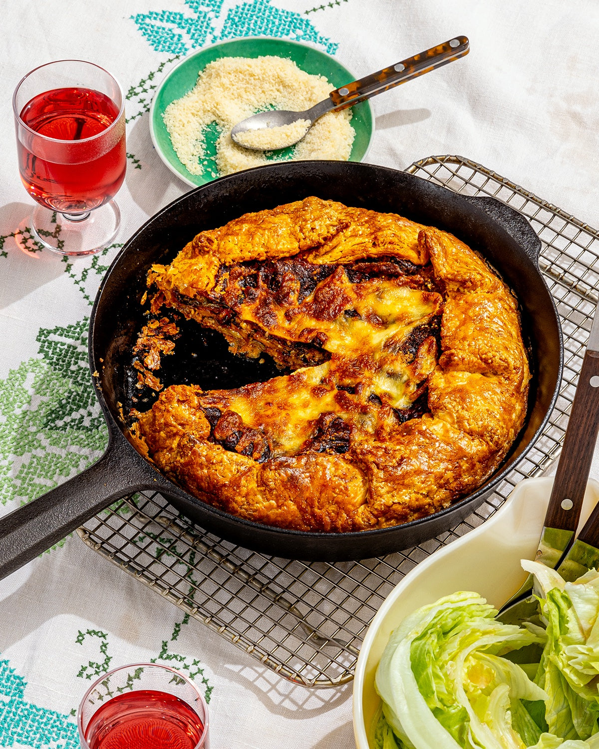 If eggplant Parmesan is on the menu, I will get it (pro move: order one for the table). I like versions that aren’t super-cheesy, with eggplant fried crunchy-crisp or left thick so the flesh goes silky—none of that flabby or dry eggplant business. Delightfully, this dish is easily galette-ified and perfectly suited in a No.8 Field Skillet. Like any good eggplant Parm, it takes some time, but the end result is worth the labor. If you happen to have homemade marinara, use it by all means; but I think Rao’s does a stellar job in the jarred-sauce department.