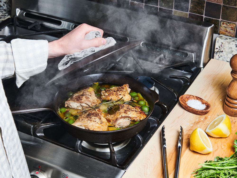 In the early days, the Field Skillet stood alone — a versatile kitchen tool that's ready for anything — but research into the vintage classics and observation in the kitchen led to an obvious conclusion: you end up reaching for a cover more often than you think, and a well-sized, self-basting lid really expands the possibilities for cooking with a cast iron skillet.