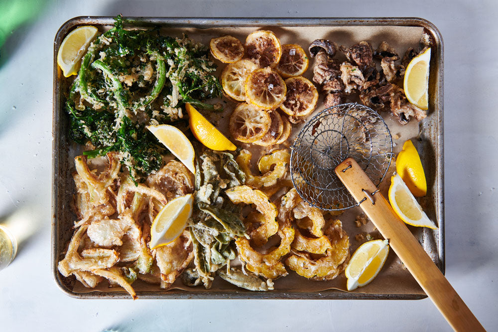 Fry the broccolini, stirring occasionally, until tender and lightly golden brown, 1 to 3 minutes. Transfer to paper towels to drain and season with salt. Let the oil return to 350°F. Working with one ingredient at a time, dredge and fry the squash, fennel, mushrooms, mushrooms, lemon, and herbs. (Frying time will vary based on the ingredients).