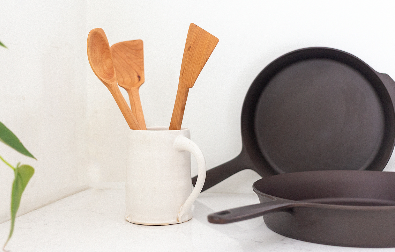 The most important factor when choosing cooking utensils for cast iron is they must be able to withstand high temperatures. Wood, metal, and silicone are safe; plastic is not. At Field Company, we generally prefer using natural materials so we’re going to focus on wood and metal (stainless steel).