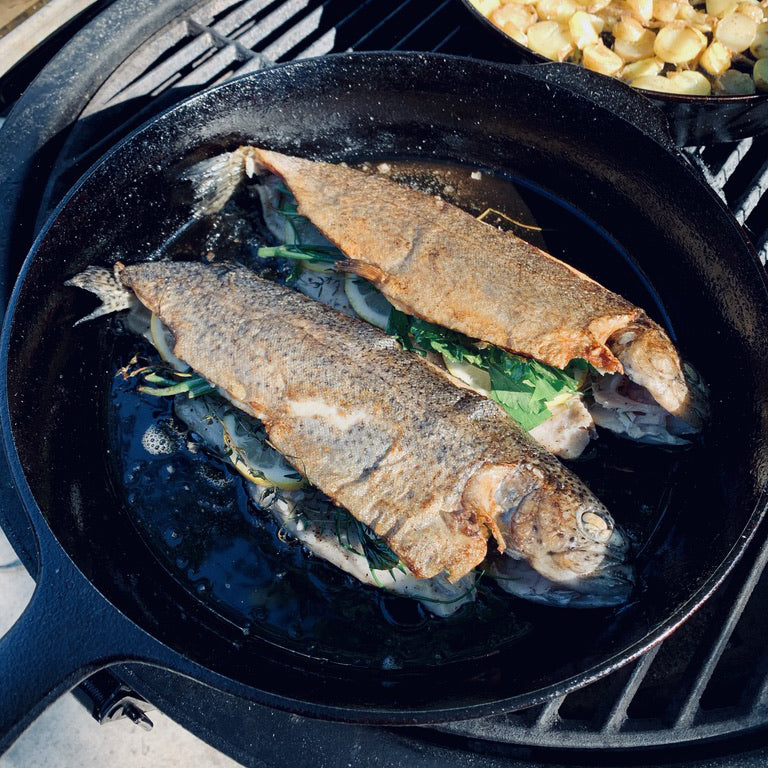 We hold that cast iron is an excellent medium for cooking any kind of fish, indoors or—during prime grilling season—outside. While you can certainly throw whole fish directly on the grill, cast iron offers two distinct advantages: 1) A properly seasoned skillet is more non-stick than even the most well-oiled grill grates, and 2) Cast iron’s evenly heated surface will give you a perfectly browned and crispy skin from head to tail.
