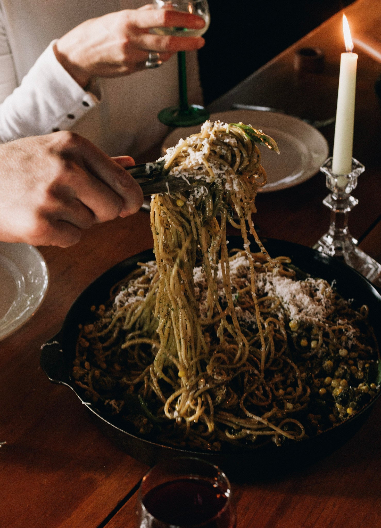 Then add your al dente pasta and stir in generous spoonfuls of pesto. Everything comes together in one pan for an easy, late-summer meal made to share.